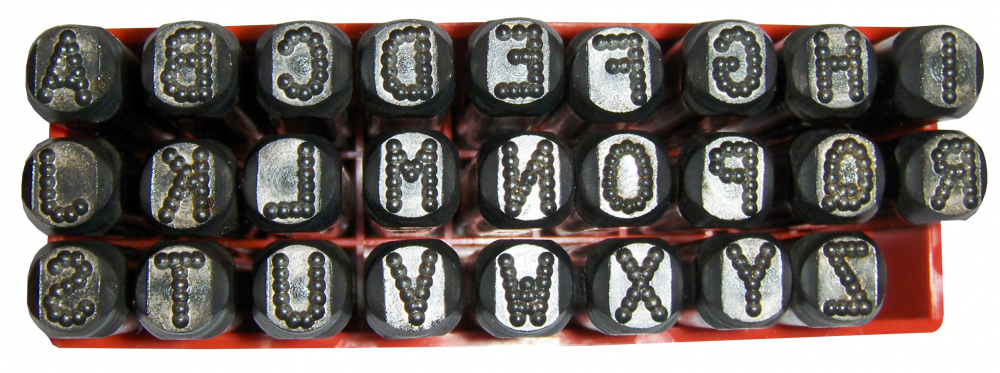 Ručné razidlá pre razenie pomocou kladiva. Sada 26 veľkých písmen A-Z. Zaoblený brit, znak je zložený z guličiek.