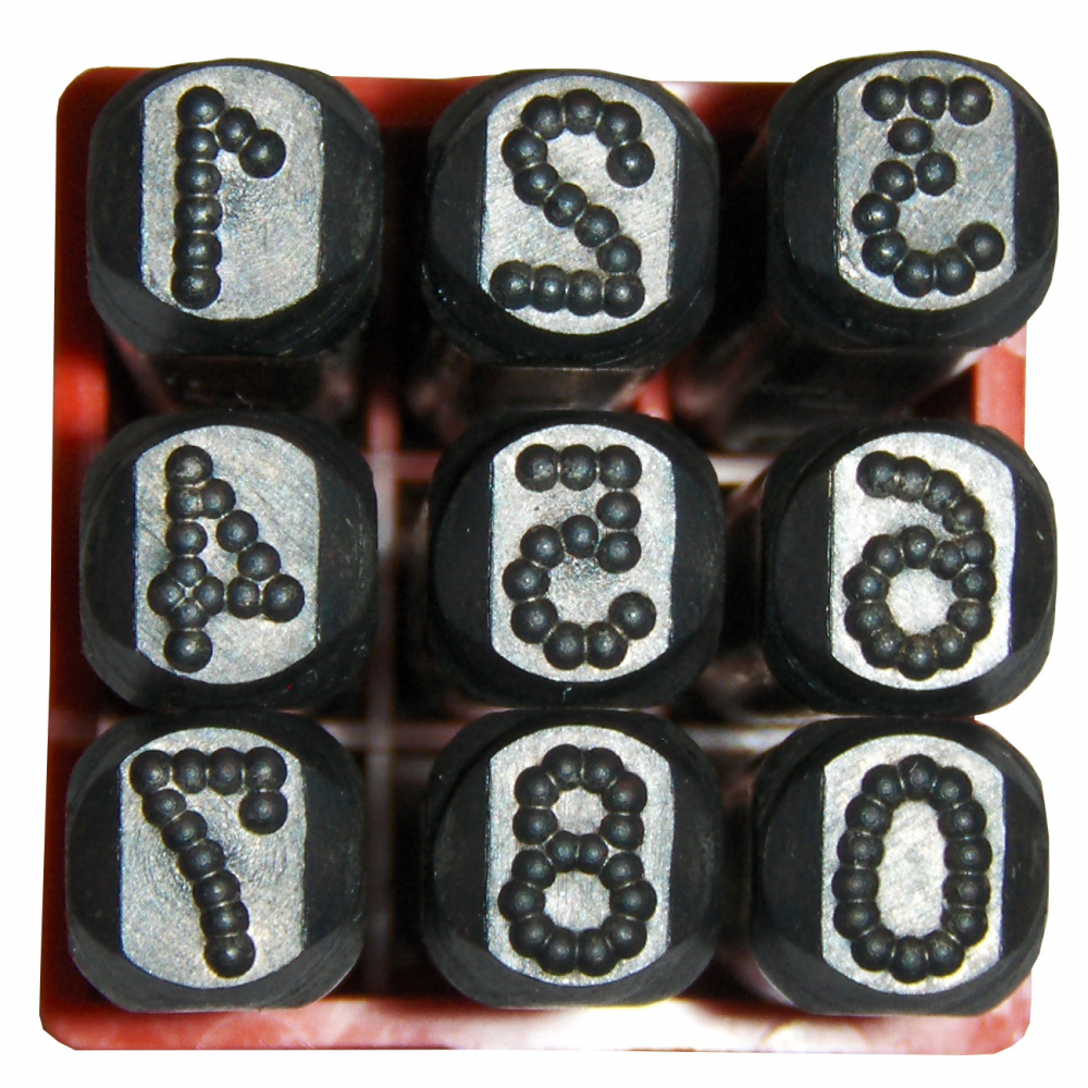 Ručné razidlá pre razenie pomocou kladiva. Sada 9 čísel, 0-9. Veľkosť 7mm má iný font, pozri obrázok.